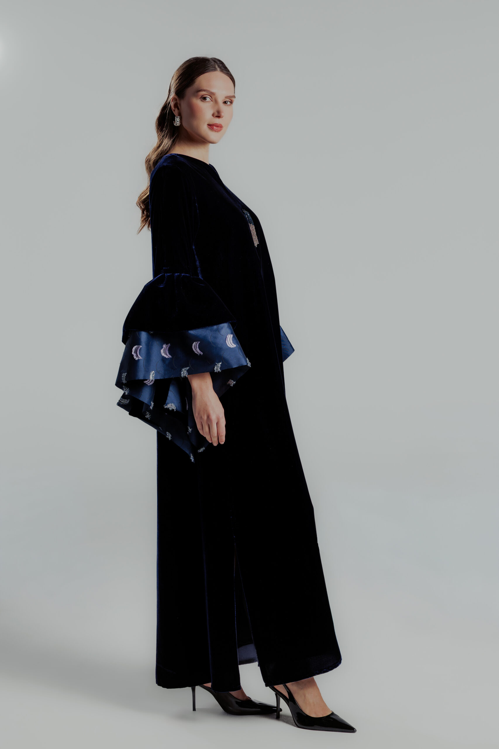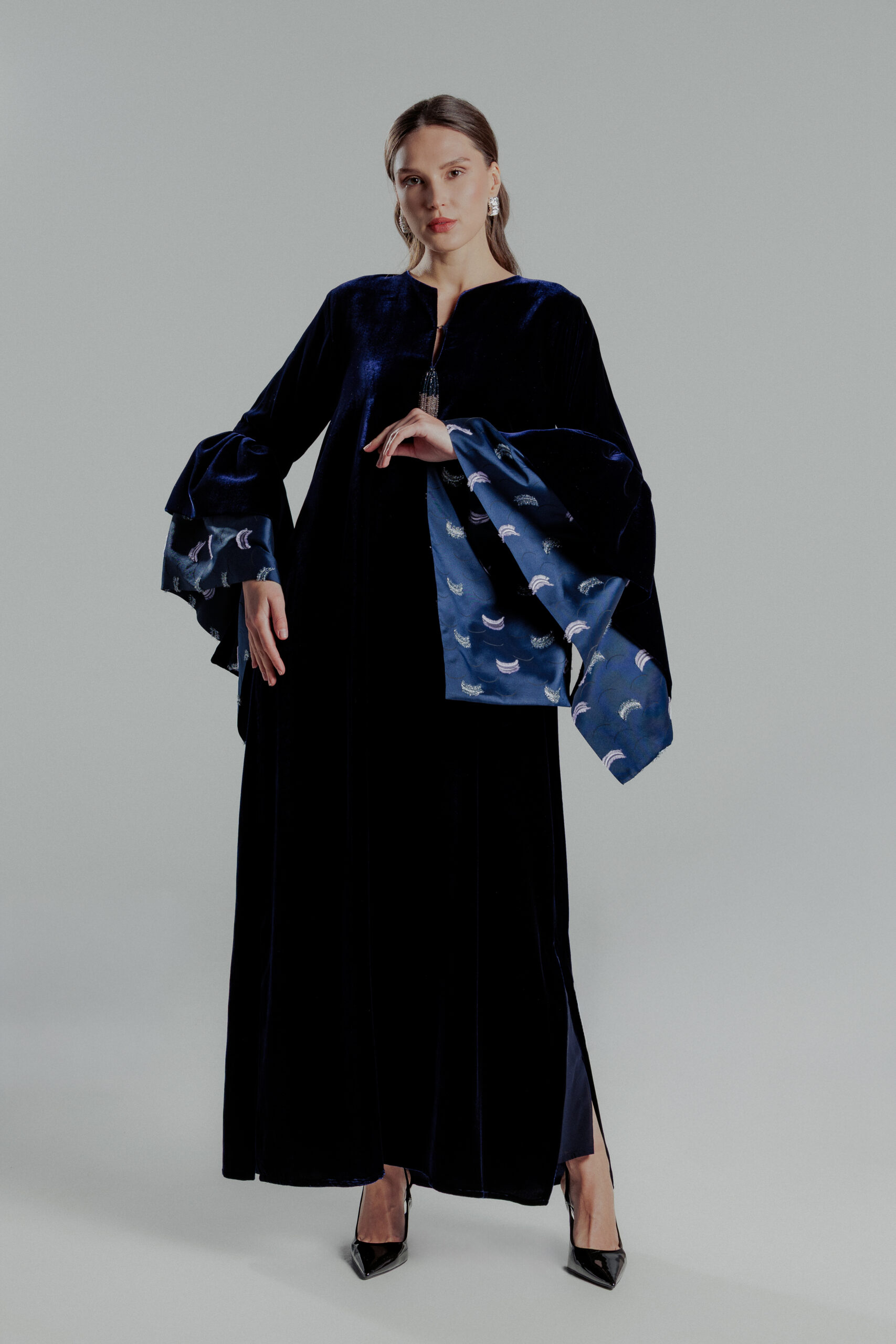 فستان مخمل كحلي باكمام منفوخه وشك والياقه