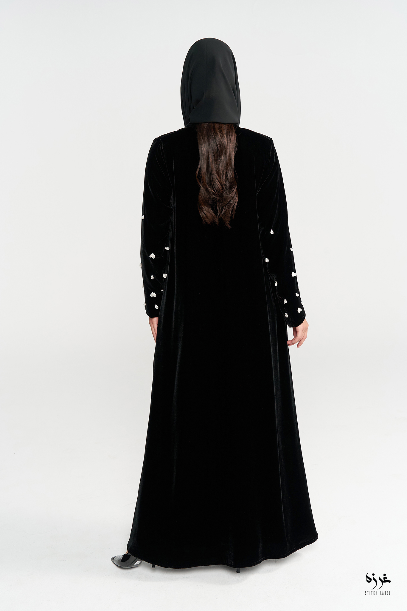 عباية مخمل أسود مشكوك بالأكمام مع طرحه شيفون وجيب مخفي