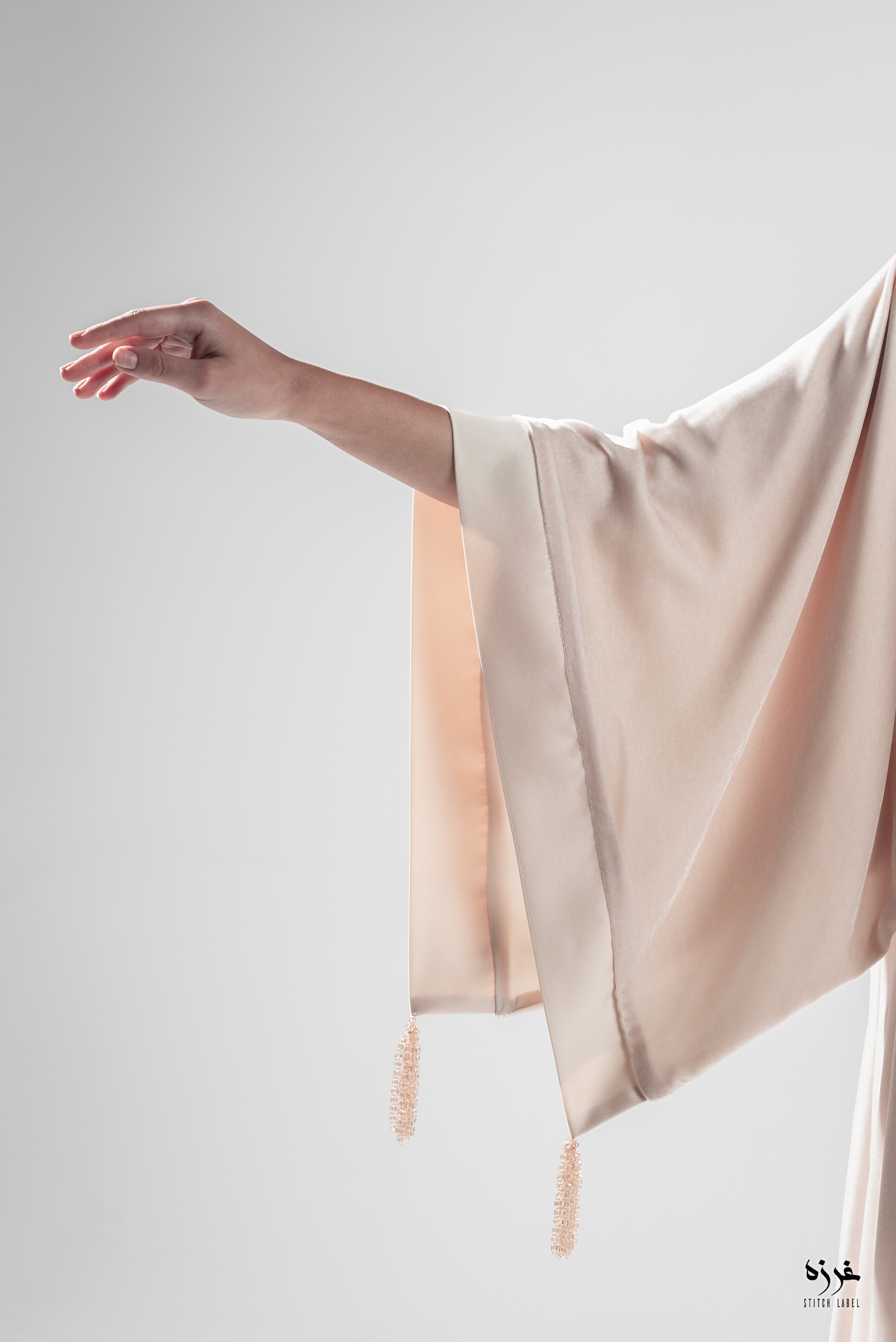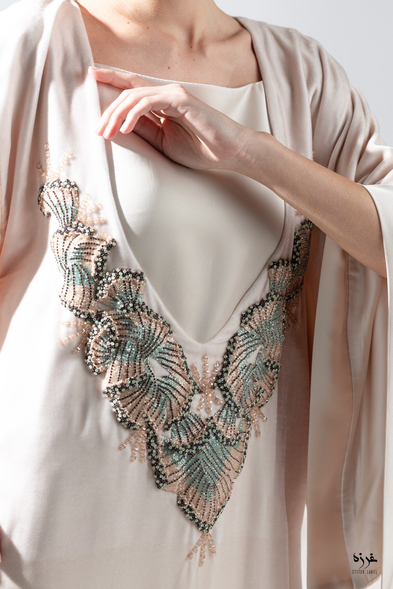 فستان مخمل بيج بأكمام مربعه وشك بالياقة