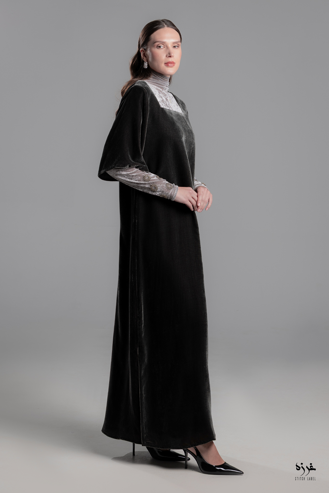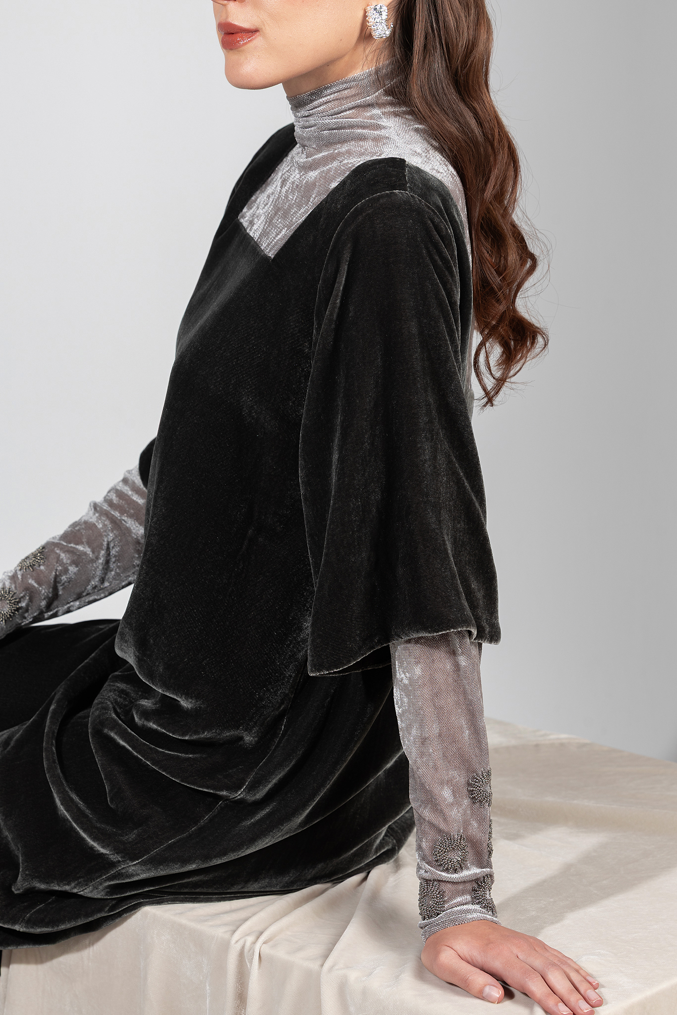 فستان مخمل رمادي بالأكمام شك