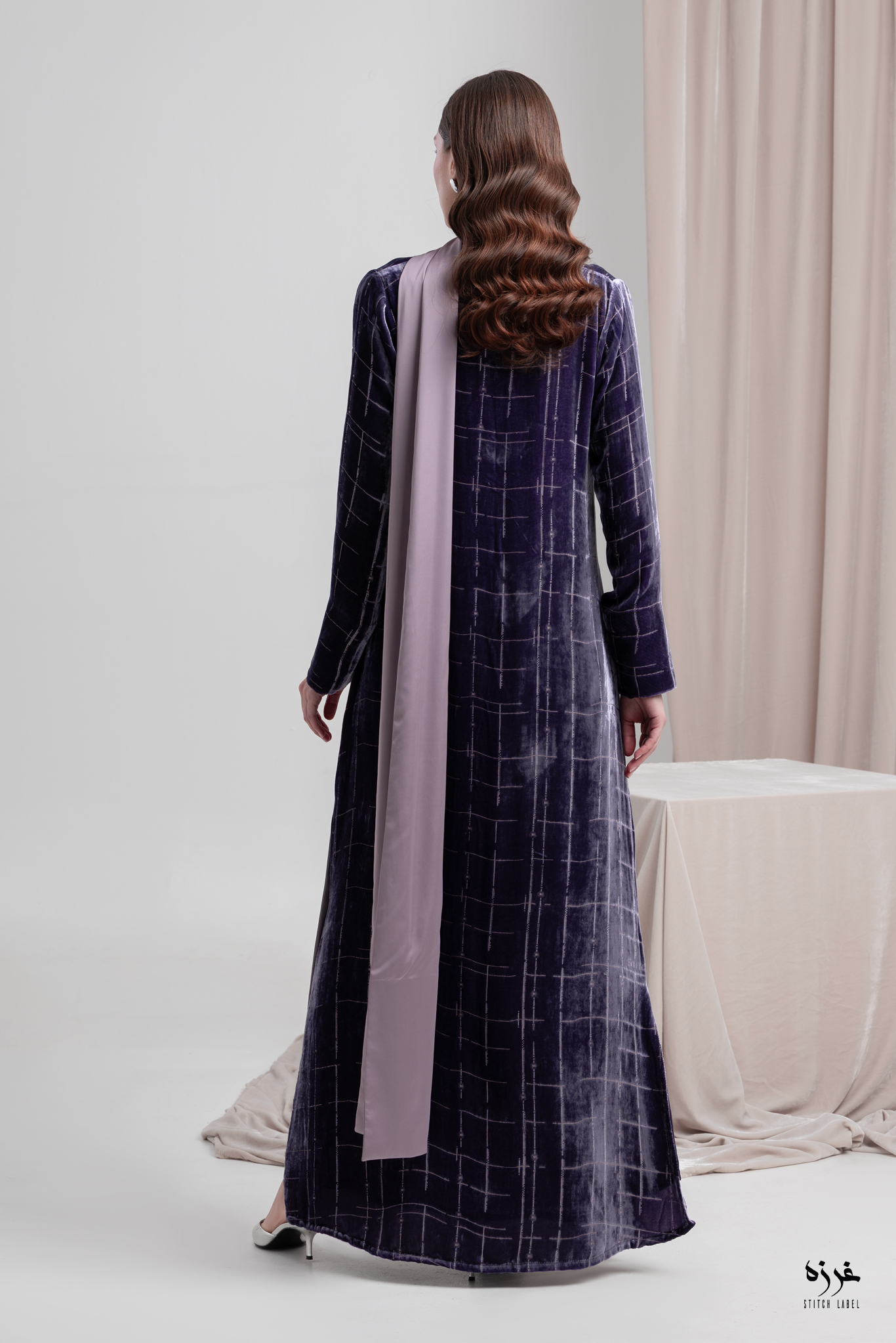 فستان مخمل موف طباعه برسمه من تصميمنا الخاص