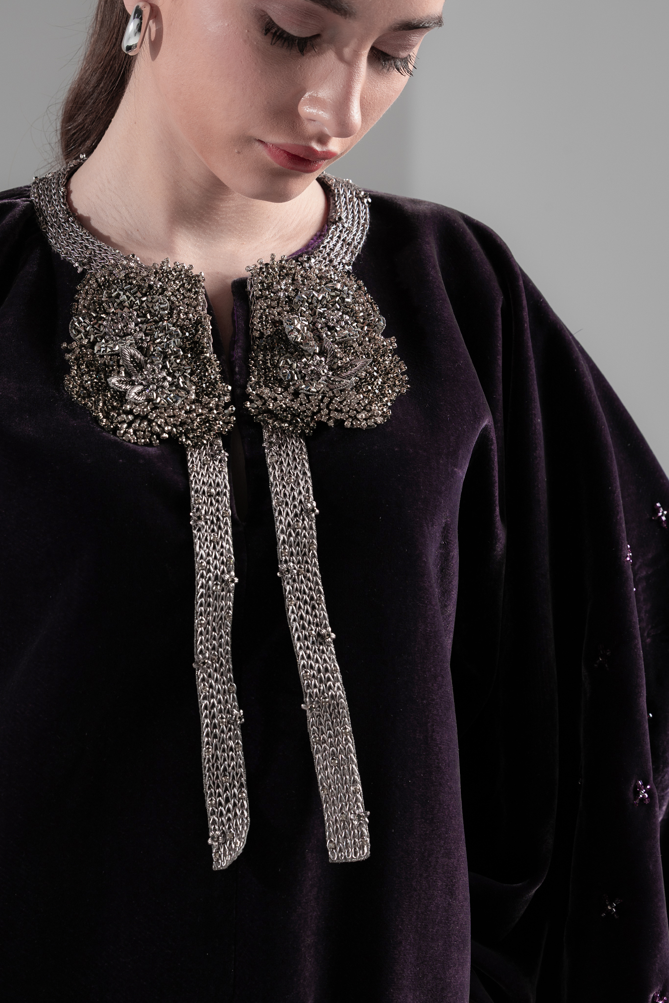 Velvet dress with embroidery in the neck