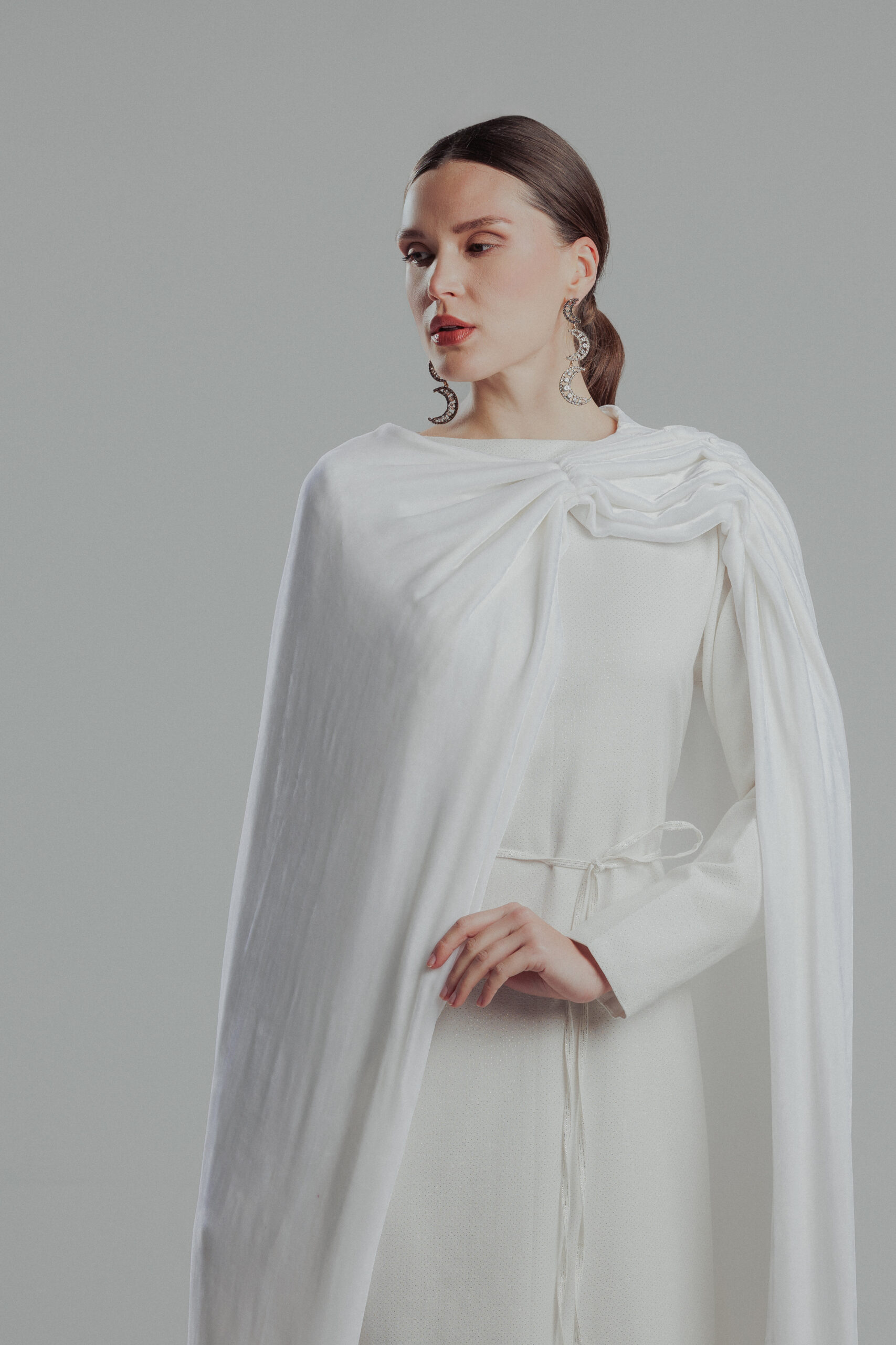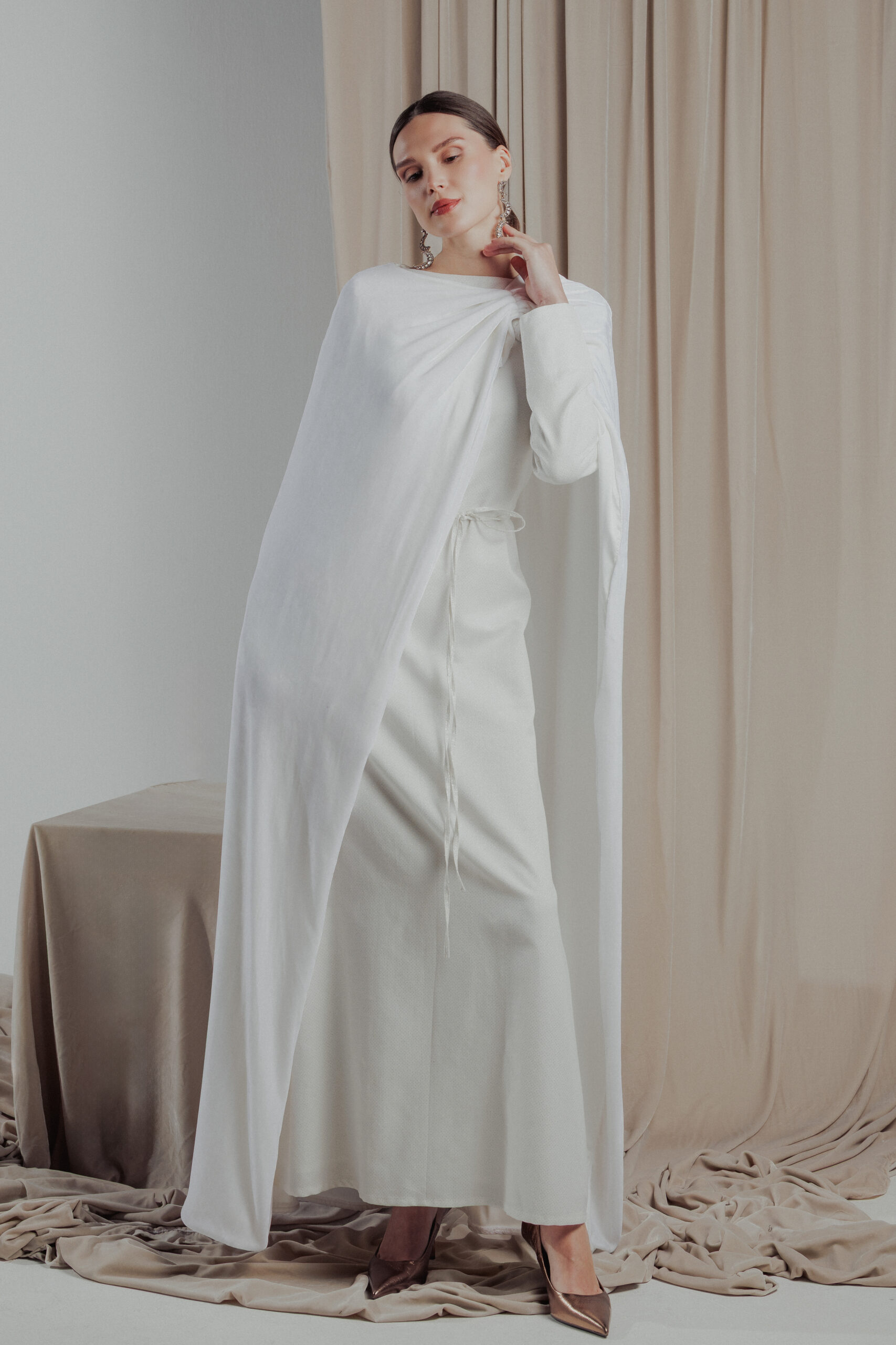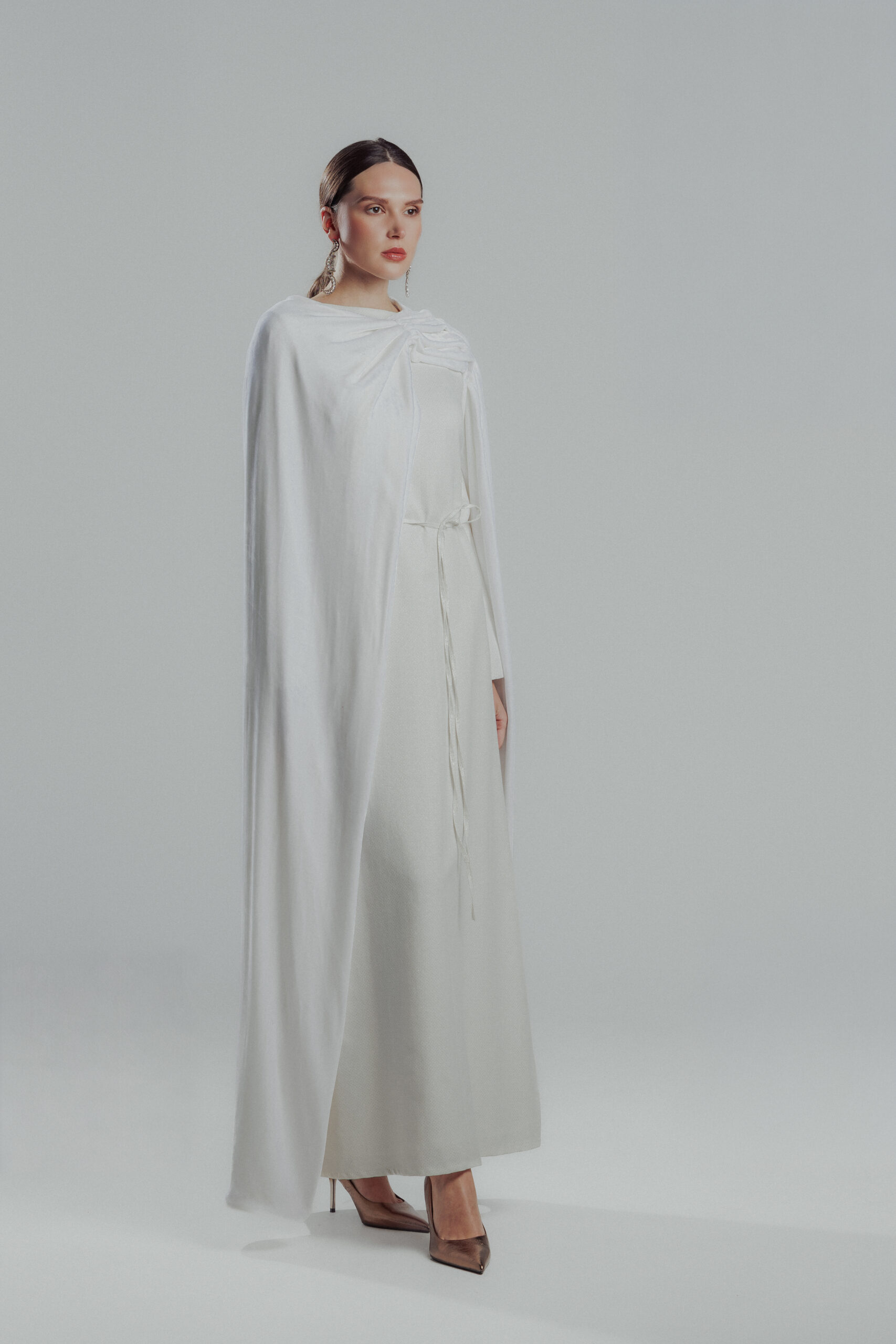 Shinny Off white dress with velvet cape