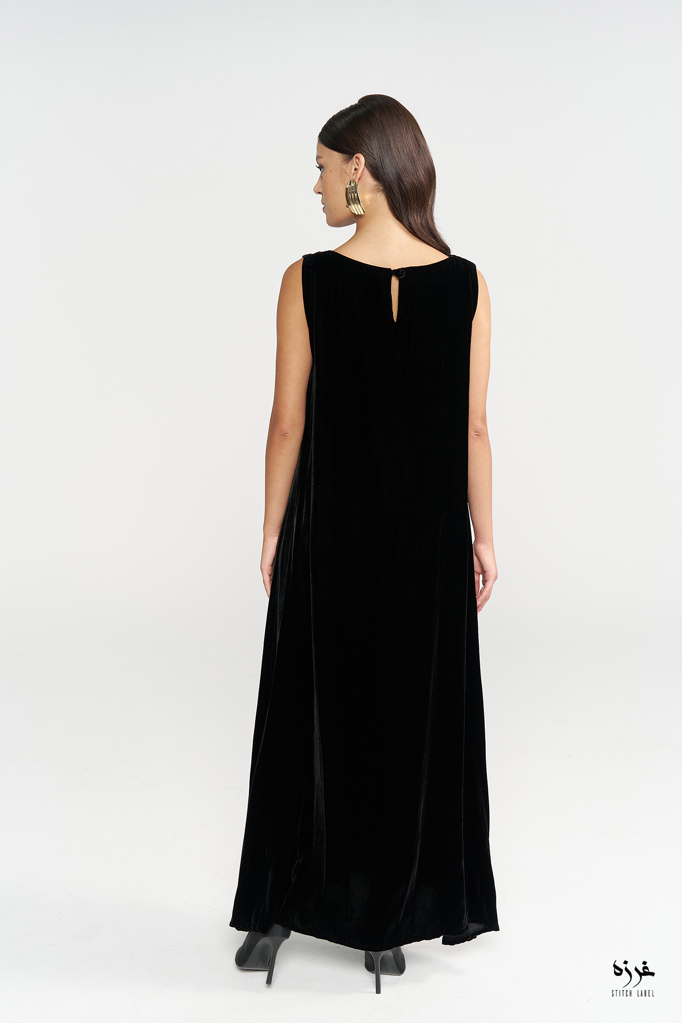 Sleeveless black velvet dress without the belt NOTE: The belt is for display only